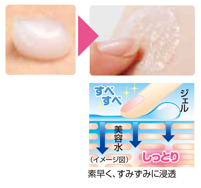 肌になじませるとジェルが美容水に変化。お肌の角質層にぐんぐん浸透します。