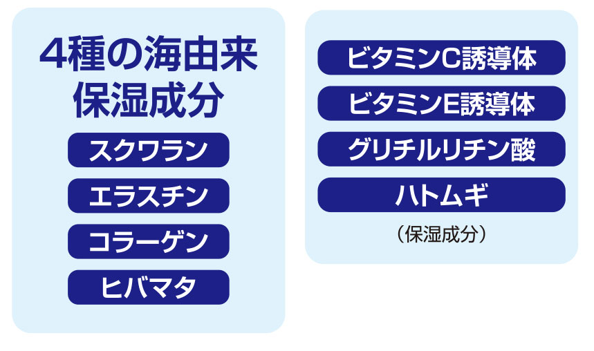4種の海の恵みと美容成分をひとつに。紫外線ダメージを防ぎながら、うるおいあふれる肌へ導きます。