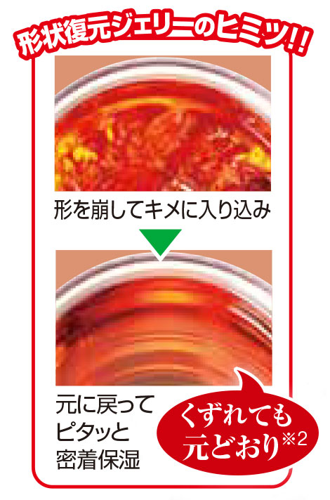 肌の溝に入り込んだジェリーがふっくらと戻り、ピンとしたハリ感のある肌へ。なじませたジェリーが肌の細かな凹凸にまで行き渡り、表情の動きにフィットしながら、内側からしっかりと潤いを与えます。