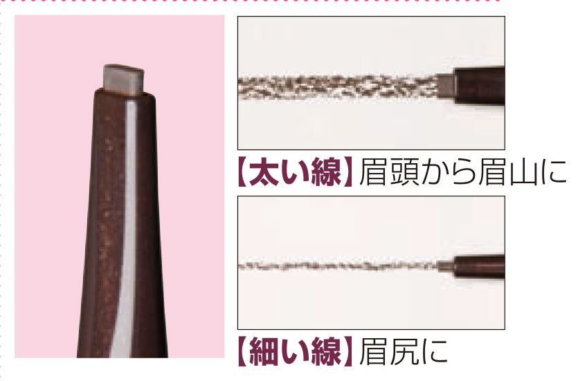 (幅の広い面は、眉頭から眉山までの太いラインに。幅の狭い面は、眉山から眉尻までの細いラインに。)