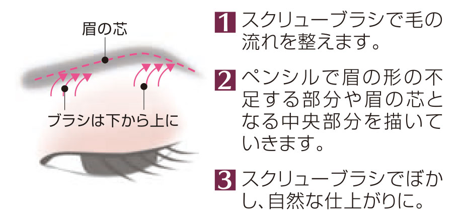 ③眉山から眉尻、眉頭から眉山の方向へ毛の流れに沿って眉毛のすき間を埋めるように1本1本描きます。