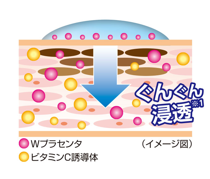 WプラセンタとビタミンC誘導体がシミに届き、集中的にアプローチします。