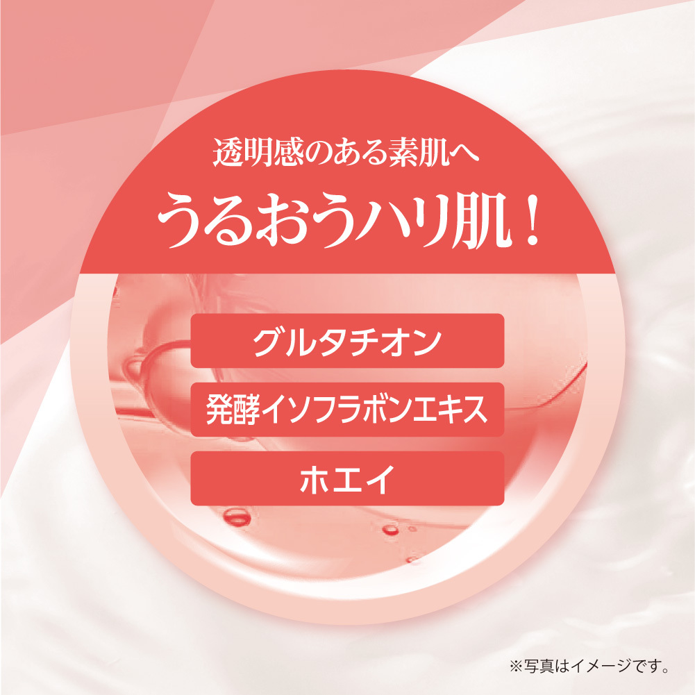 グルタチオン、発酵イソフラボンエキス*¹、ホエイ*²などのエイジングケア*³成分を配合。乾燥によりごわついた肌もしっかりやわらげ、うるおいを肌に届け*⁴、やわらかハリ・ツヤ・透明肌に仕上げます。(すべて保湿成分)