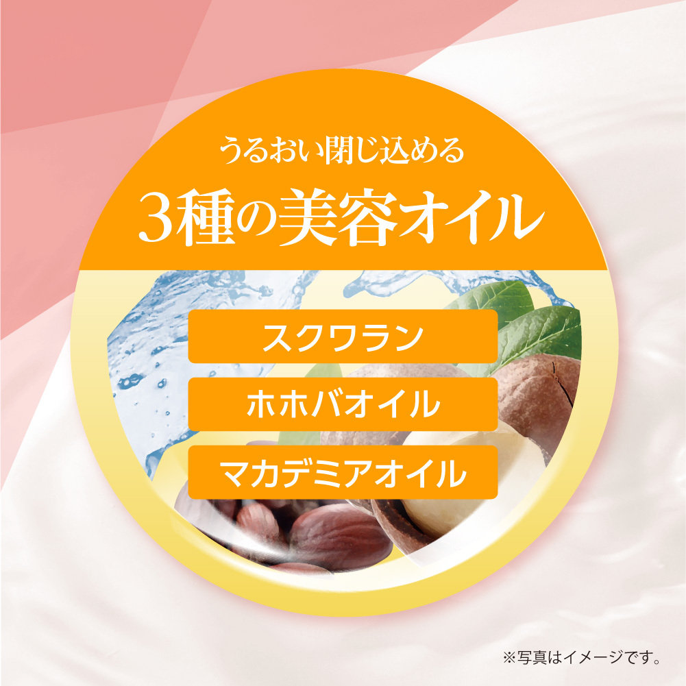 マイクロエマルション製法により、3種の美容オイルをバランスよく配合。乾燥した肌にすみずみまで*いきわたり、うるおいを密封。肌を乾燥から守ります。