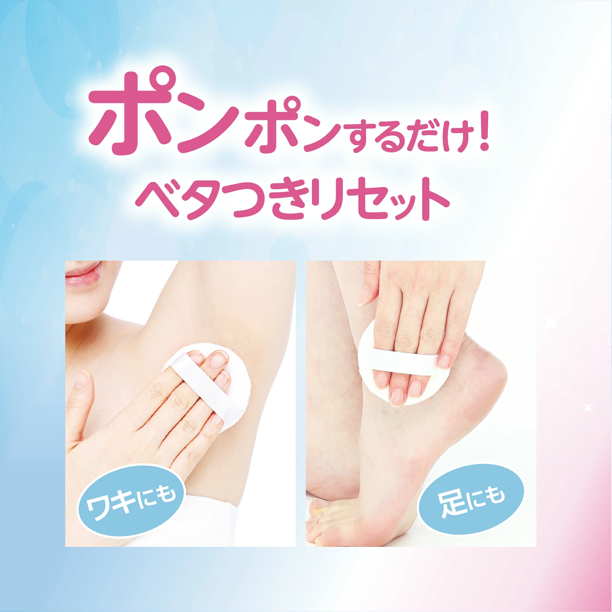 気になるワキや襟足、足などに、ポンポンするだけでニオイを防ぎながら、さらっとした肌に整えます。